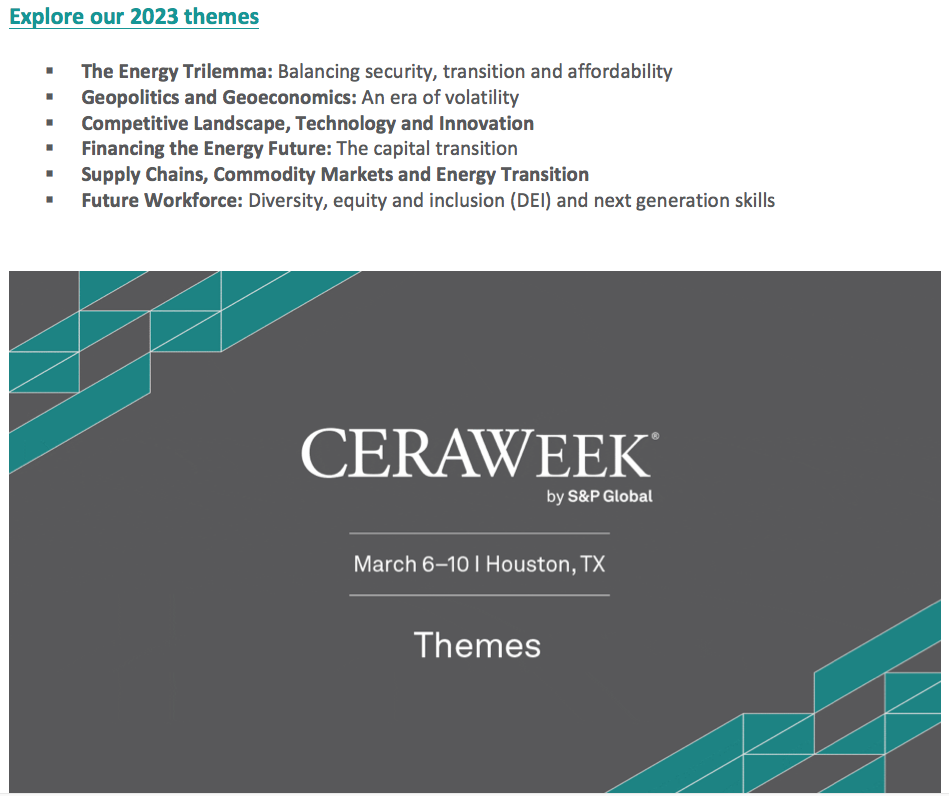 Dic 02, 2022 CERAWeek 2023 Marzo 6 – 10 “Navegando por un mundo turbulento: energía, clima y seguridad” Las principales autoridades mundiales de la energía se reúnen en Houston