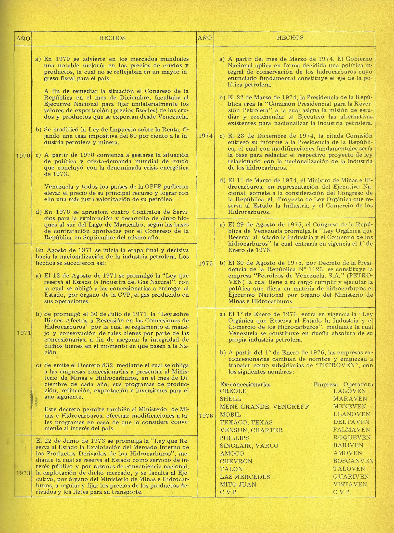 El 1º de Enero de 1976 entra en vigencia la “Ley Orgánica que Reserva al Estado la Industria y el Comercio de los Hidrocarburos”, mediante la cual Venezuela se constituye en dueña absoluta de su petróleo.