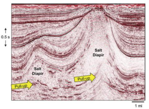 Fig. 2: Alto estructural, en la base de un diapiro de sal donde se generan varios artefactos (pull-up), por efecto del incremento de velocidad cuando la onda sísmica atraviesa la sal. (Sánchez, 2025)