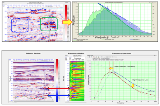 Fig. 4: a) Diferencia observada en el contenido de frecuencia entre hidrocarburos y no hidrocarburos, se sugiere que la zona que contiene hidrocarburos tiene una mayor atenuación (verde), menor frecuencia dominante y un menor contenido de alta frecuencia, mientras que la zona que no es yacimiento tiene una menor atenuación (azul), indicada por una mayor frecuencia dominante y un mayor contenido de alta frecuencia. b) Aplicando AVF (mediante el análisis del espectro de frecuencia generado por el espectro de frecuencia de la muestra de tiempo de cada gather), se traza una línea que ajuste la curva con la frecuencia (x) de la forma y = I + G sin^2(x), en que el gradiente (G) representa la inclinación del espectro de frecuencia, mientras que el intercepto (I) representa la amplitud que se correlaciona con un punto brillante (bright spot). El valor de la pendiente se utiliza para medir la atenuación cualitativamente en relación con la tendencia o las trazas cercanas en la zona atenuante (presencia de hidrocarburos), La selección del rango de frecuencia (x) para generar tanto I como G se realiza sobre el análisis del espectro de frecuencias sobre ciertos intervalos de la zona objetivo, con la intención de evitar errores debido a la diferencia significativa en el contenido de frecuencia a lo largo de un intervalo extenso o a una tendencia diferente. La anomalía identificada en el AVF puede utilizarse para delimitar, mapear y jerarquizar el yacimiento, siendo un aliado para el ojo del intérprete y un filtro rápido, para identificar zonas que contienen hidrocarburos (señalado con la flecha roja), de la zona que no contienen (señalada con la flecha azul). (Mandong et.al,2021).