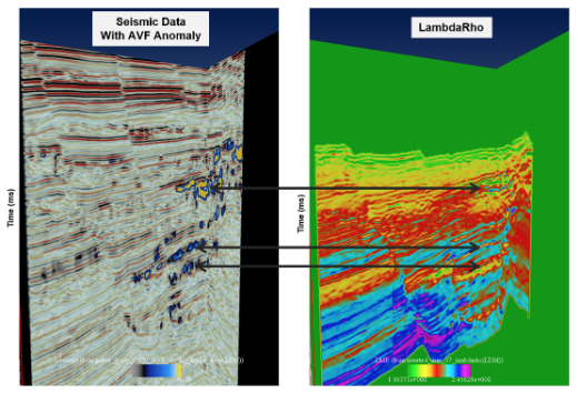 Fig. 5 El método AVF muestra una anomalía consistente con el bajo valor de lambdaRho, el cual, representa una baja incompresibilidad relacionada con la presencia de hidrocarburos. (Mandong et.al,2021).