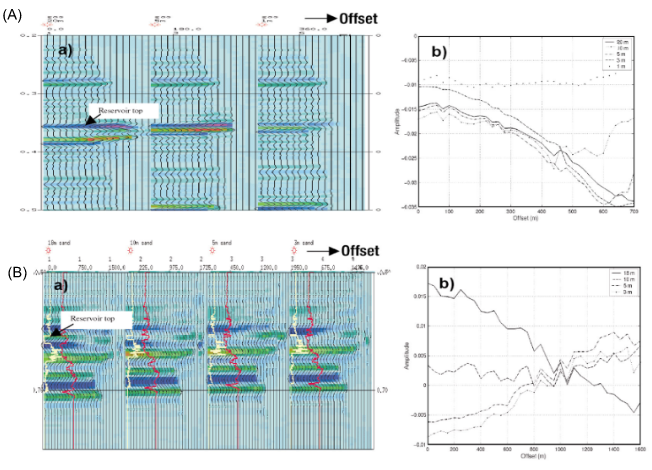 Fig.6. Para demostrar el efecto de entonación, y de ancho de banda reducida en el dato sísmico, para una arena gasífera, se generan registros de cmp- gather sintéticos de los pozos, con el objetivo de ver su respuesta, observándose: (A) la anomalía AVO/AVA de clase III en el yacimiento de baja velocidad y de poco espesor (5m), en una arena no consolidada, todavía puede ser observada. (B) La anomalía AVO/AVA clase I responde de manera diferente en su polaridad; en offset cercanos se visualiza como un valle; mientras que offset lejanos se muestra como un pico, para una arena de espesor de 18 m. (Sánchez, 2025)