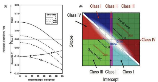 Fig. 7 (A) Curvas de respuestas de anomalías AVO desde la clase I a la IV: La clase I tiene un coeficiente de reflexión normal positivo y un gradiente negativo, la clase II tiene un coeficiente de reflexión normal pequeño cercano a cero con gradiente negativo, y la clase III tiene un coeficiente de reflexión normal negativo y un gradiente negativo. La clase IV incluye un coeficiente de reflexión normal negativo pero un gradiente positivo, por lo tanto, la amplitud disminuye con el aumento del offset en un yacimiento clástico saturado de gas; (B) Esquema de clasificación para identificar la magnitud y la clase en una reflexión sísmica. (Sánchez, 2025)
