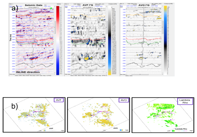 Fig. 8 a) la anomalía que muestra el AVF i*G (medio) es consistente tanto con el AVO I*G (derecha) y el registro de Sw en la localización del pozo, como de la sección sísmica post-stack (izquierda). b) Las anomalías AVF generalmente muestran consistencia con el AVO y el lambdaRho. (Mandong et.al,2021).