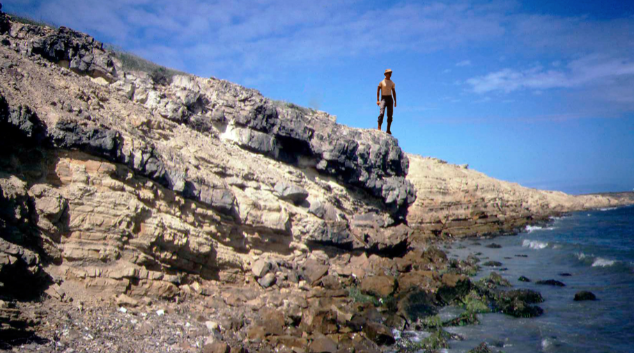 Jhonny Casas sobre afloramientos del Eoceno Medio, con vistas al mar Caribe, en el noreste de Venezuela.