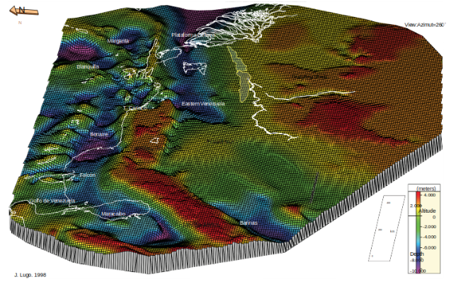La perspectiva venezolana del basamento que encierra rocas del Precámbrico y el Paleozoico revela 17 depocentros. Los sedimentos de la cuenca abarcan desde el Neoproterozoico hasta la actualidad y son resultado de diversos orígenes, incluyendo procesos de rifting, márgenes pasivos, cuencas de foreland)y de backarc, cuencas transtensionales, estructuras de pull-apart y aulacógenos. (Imagen producida por Jairo Lugo, 1998.)