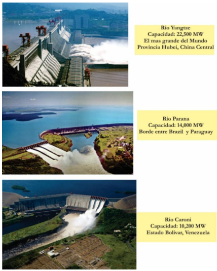 - La represa de Itaipú, sobre el río Paraná, en la frontera entre Brasil y Paraguay: Capacidad: ~14.000 MW. Está ubicada allí debido a su alto caudal y al fuerte desnivel. Dependiendo de las precipitaciones, la presa de Itaipú compite regularmente con la de las Tres Gargantas por la mayor generación anual de electricidad.