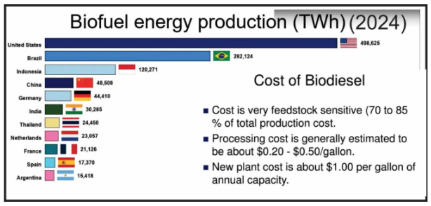 La industria mundial de biocombustibles alcanzó una producción de aproximadamente 200 mil millones de litros anuales, siendo Estados Unidos y Brasil los mayores productores, con más del 80 % de la producción mundial total. En términos de bioenergía, se produjeron 711 TWh en 2024, lo que representa el 7 % de la electricidad renovable mundial.