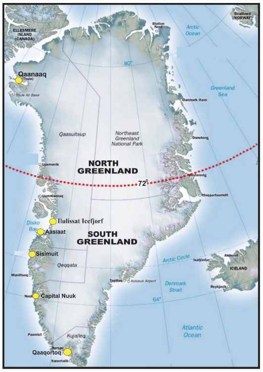 Debido al gran tamaño de la isla, situada entre los 59° y los 83° de latitud norte y con una extensión de 1.660 millas (2670 km) de norte a sur, las condiciones climáticas varían considerablemente entre el norte y el sur de Groenlandia. Las diferencias de temperatura entre ambas regiones han influido notablemente en la ubicación de los pequeños asentamientos y pueblos. Por ello, la mayoría se encuentran en las zonas costeras occidentales del sur de Groenlandia, donde el clima es más templado. La escasa población de la isla, de tan solo 56.000 habitantes, también se debe a sus condiciones climáticas frías y rigurosas.