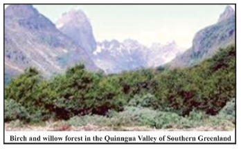 En cuanto a la vegetación de la isla, los árboles grandes y los bosques son prácticamente inexistentes. Solo donde existen microclimas más cálidos, como en el extremo sur, que experimenta temperaturas ligeramente más altas y estaciones de crecimiento más largas, se dan las condiciones localizadas adecuadas para el crecimiento de árboles. Además, los valles y fiordos protegidos ofrecen refugio en el valle de Qinngua, donde el único bosque natural de la isla está dominado por: 1) el abedul pubescente (birch) (Betula pubescens), 2) el sauce de hoja gris (willow) (Salix glauca), que puede alcanzar los 7-8 metros de altura, 3) el serbal de Groenlandia (Sorbus decora) y 4) el aliso verde (Alnus alnobetula). Existen otras plantaciones más pequeñas y bosques experimentales cerca de las ciudades del sur, como Narsarsuaq y Qanasiassat.