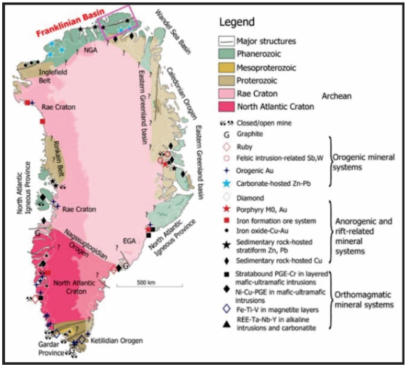 La mayor parte de la superficie de Groenlandia está cubierta de hielo (80%), lo que oculta gran parte del lecho rocoso. Sin embargo, donde este aflora, predominan rocas cristalinas muy antiguas, con algunas zonas sedimentarias y volcánicas más jóvenes en los márgenes. Al igual que otros escudos graníticos precámbricos similares (por ejemplo, el Escudo de Guayana en Venezuela, el Escudo Granítico Precámbrico de África y el Escudo Precámbrico Australiano), Groenlandia es una fuente de abundantes minerales importantes.