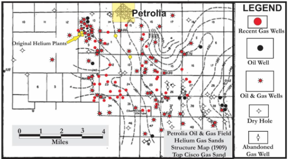 En EE. UU., se encontró helio en cantidades significativas en el gas natural, en 1903, en un pozo de gas cerca de Dexter, Kansas que produjo este gas no combustible. Los análisis mostraron que contenía un alto porcentaje de helio. Con esto el país se convirtió posteriormente en el principal productor mundial de helio en el siglo XX gracias a las grandes reservas de gas natural en Texas, Oklahoma y Kansas. El ejército estaba interesado en el helio para globos y dirigibles y construyó la primera planta de extracción de helio, en 1915, en el pueblo de Petrolia, Texas. Cerca de este pueblo, en 1909, se descubrió un importante yacimiento de petróleo y gas natural, con un promedio de casi un 1 % de helio. La Armada de los Estados Unidos construyo tres plantas experimentales de helio durante la Primera Guerra Mundial para recuperar suficiente helio para abastecer globos de barrera con este gas no inflamable y más ligero que el aire. Dos de las plantas experimentales, al norte de Fort Worth, Texas, recuperaban helio del gas natural y transportado por tuberías desde el yacimiento de gas de Petrolia, en el condado de Clay en Texas.