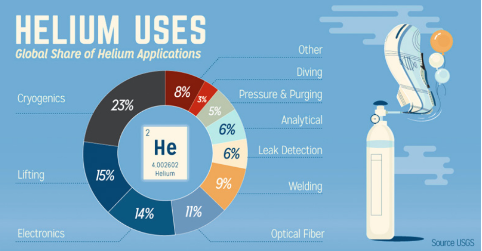 - Fabricación de fibra óptica, sistemas aeroespaciales y de cohetes, detección de fugas en equipos de alta precisión. A medida que la IA, los vehículos eléctricos y la informática avanzada crecen, también crece la demanda de helio.