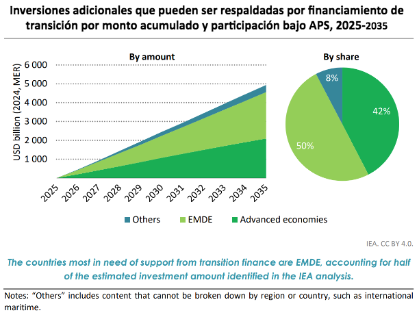 Uno de los análisis clave de la AIE que contribuye a los debates de la COP30 es el informe «Ampliación de la financiación para la transición», que ofrece orientación práctica para impulsar la inversión en la transición hacia la energía limpia. Lograr los objetivos climáticos y de sostenibilidad establecidos en la COP requiere reducciones significativas de las emisiones de los sectores, empresas y países con altas emisiones. Sin embargo, muchas medidas de gran impacto tienen dificultades para atraer la financiación adecuada o financiación verde. Aquí es donde la financiación para la transición desempeña un papel fundamental.