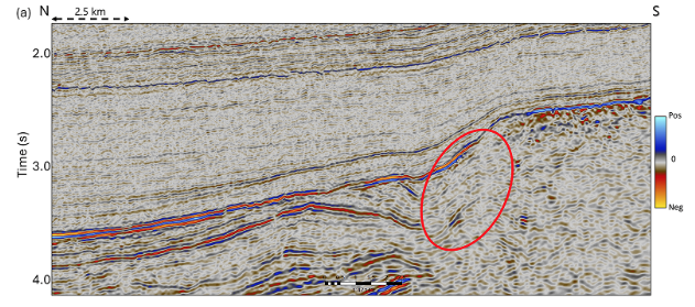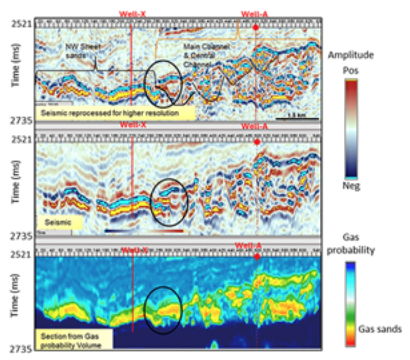 Comparación de secciones que atraviesan (a) datos sísmicos reprocesados, (b) datos sísmicos antiguos y (c) el volumen de probabilidad de gas generado a partir de los datos sísmicos reprocesados. Las secciones atraviesan dos pozos perforados en la Lámina Noroeste (Pozo X) y el segmento principal del canal (Pozo A). El área marcada con un círculo muestra una posible zona de conectividad entre los segmentos. Sin embargo, el pozo de relleno perforado en la Lámina Noroeste resultó estar prácticamente aislado del canal principal.
