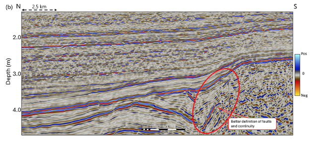 Comparación de segmentos de secciones sísmicas provenientes de volúmenes (a) migrados en tiempo antes de la apilamiento y (b) migrados en profundidad antes de la apilamiento (migración por haces). Los datos migrados en profundidad muestran una mejor definición de las fallas y mayor continuidad en comparación con la migración en tiempo. En la sección ampliada migrada en profundidad que se muestra en la figura 1c, se observa una geometría de delineación de fallas adecuada.