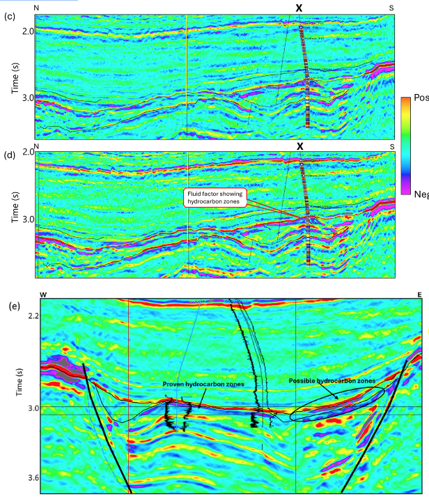 Comparación de segmentos de secciones sísmicas de volúmenes con (a) desplazamiento cercano y (b) desplazamiento lejano. Se observa un aumento de la amplitud en la parte superior del yacimiento en la sección de desplazamiento lejano. Una comparación similar de segmentos de secciones de volúmenes de apilamiento de fluidos generados (c) antes de la perforación del pozo exploratorio y (d) después de integrar los resultados de dicho pozo. Los valores negativos del apilamiento de fluidos se han interpretado como la presencia de fluidos, que se aprecian claramente, como se indica con el texto del puntero. (e) Una sección ampliada de una sección de apilamiento de fluidos en dirección oeste-este muestra las zonas de hidrocarburos probadas y potenciales.