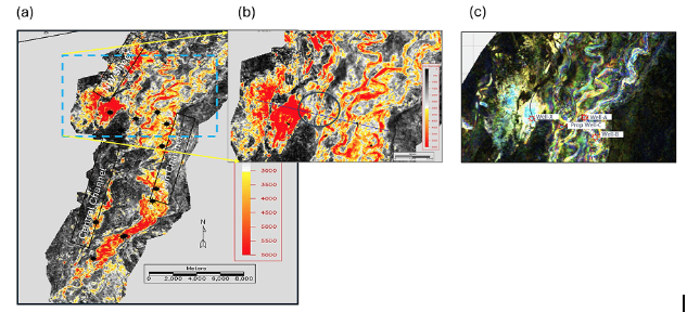 La sección horizontal muestra un yacimiento de canal de talud en aguas profundas, tal como se observa en la imagen (a) de amplitud sísmica, y un acercamiento de una pequeña porción del canal se muestra en (b). (c) Magnitudes espectrales con codificación de color RGB generadas a partir de la descomposición espectral de los datos sísmicos. La geometría del canal se aprecia mejor definida en la visualización de magnitudes espectrales con codificación de color RGB, pero no se obtuvo ninguna ventaja adicional en términos de reducción de la incertidumbre.