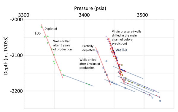 Sin embargo, cuando se perforó el Pozo X en 2012, después de siete años de producción de los pozos del Canal Principal, se encontró presión virgen, lo que demuestra que la Lámina Noroeste está hidráulicamente aislada del complejo del Canal Principal (figura 5). Este resultado pone de manifiesto la persistente ambigüedad de las predicciones de conectividad basadas en datos sísmicos y la necesidad de precaución al utilizar únicamente datos sísmicos para evaluar la comunicación entre yacimientos.