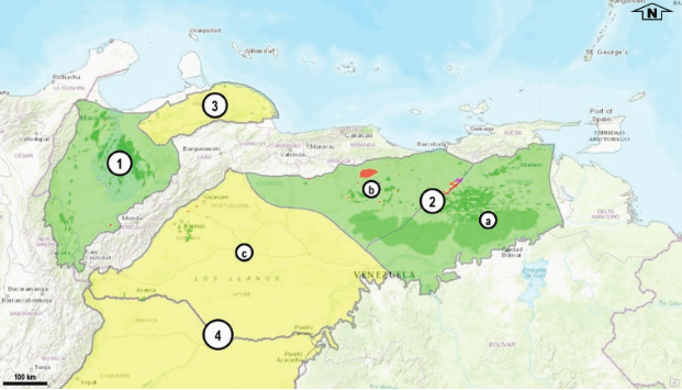 Cuencas productoras terrestres de Venezuela: Verde: Supercuencas de Maracaibo (1) y Oriente venezolano (2), con las subcuencas de Maturín (a) y Guárico (b). Amarillo: Cuenca de Falcón (3) y subcuenca de Barinas-Apure (c), que forma parte de la cuenca de los Llanos Orientales de Colombia (4). Los yacimientos petrolíferos aparecen en verde, con verde indicado para los yacimientos de la Faja Petrolífera del Orinoco. Los yacimientos de gas aparecen en rojo. Modificado de Arminio et al. (2025) y U3 EXPLORE (2026) y World Topo Map en https://services.arcgisonline.com/ArcGIS/services. (12 de Octubre de 2024).
