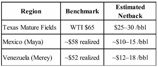 Si bien los márgenes pueden parecer menores para crudos más pesados, especialmente en México y Venezuela, una ventaja económica es que la mayor parte de la infraestructura ya existe. Además, las ganancias de producción a menudo provienen de intervenciones de bajo costo, como: