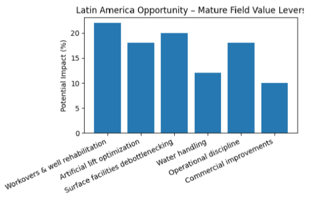 Dado que los requisitos de capital son modestos, incluso pequeños aumentos de producción pueden mejorar significativamente el flujo de caja total del campo. Gran parte del potencial de producción futura en estos países productores de petróleo no reside en nuevos descubrimientos, sino en la mejora de los activos existentes. La rehabilitación de pozos, la optimización de los sistemas de levantamiento artificial y la modernización de las instalaciones de superficie representan oportunidades significativas para aumentar la producción y el flujo de caja sin una inversión masiva de capital.