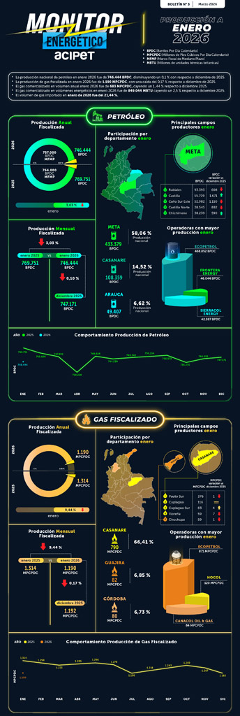 - La producción nacional de petróleo en enero 2026 fue de 746.444 BPDC, disminuyendo un 0,1% con respecto a diciembre de 2025.
