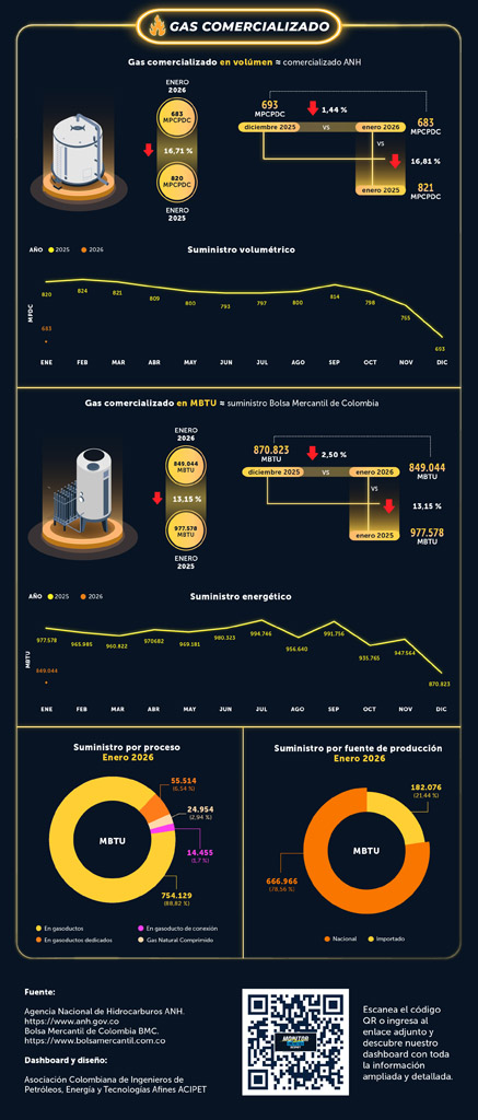 - El gas comercializado en volumen anual enero 2026 fue de 683 MPCPDC, cayendo un 1.44% respecto a diciembre 2025.