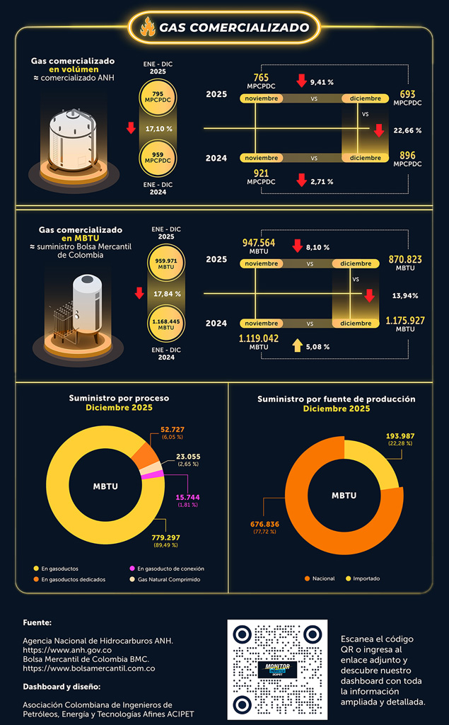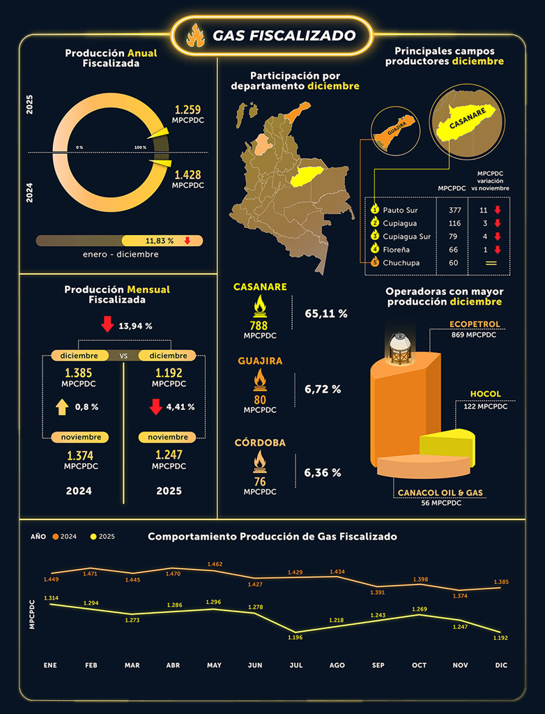 - El gas fiscalizado en 2025 fue de 1.259 MPCPDC, con una caída del 11,83 % respecto al 2024