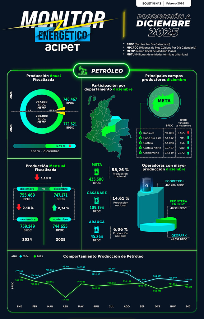 - La producción nacional de petróleo pasó de 772.624 BPDC en 2024 a 746.467 BPDC en 2025