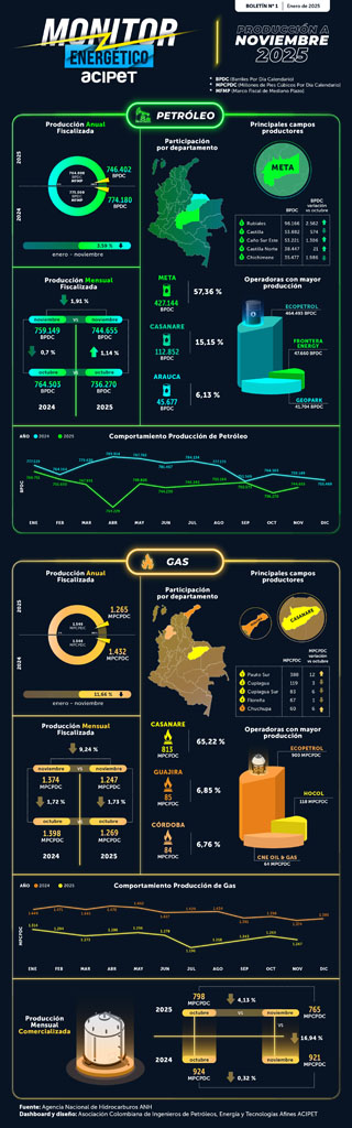 ACIPET presenta el Boletín Monitor Energético, una nueva herramienta técnica que consolida y visualiza los principales indicadores de producción de petróleo y gas en Colombia.