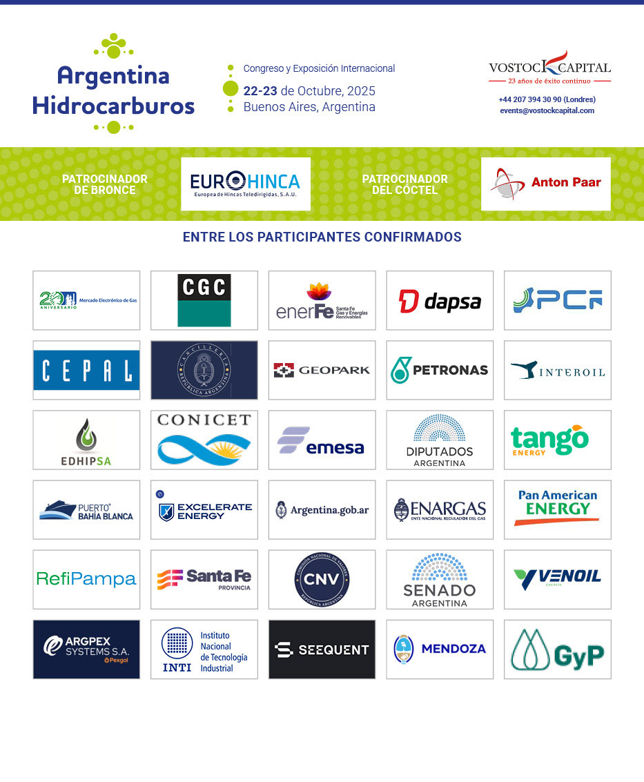 Estamos emocionados de dar la bienvenida a más de 150 ejecutivos de hidrocarburos a nivel C en el próximo Congreso y Exposición Internacional Argentina Hidrocarburos 2025 (22-23 de octubre, Buenos Aires). No pierda la oportunidad de unirse a esta reunión exclusiva, asegure su lugar ahora para conectarse con los tomadores de decisiones que dan forma al futuro energético de Argentina.