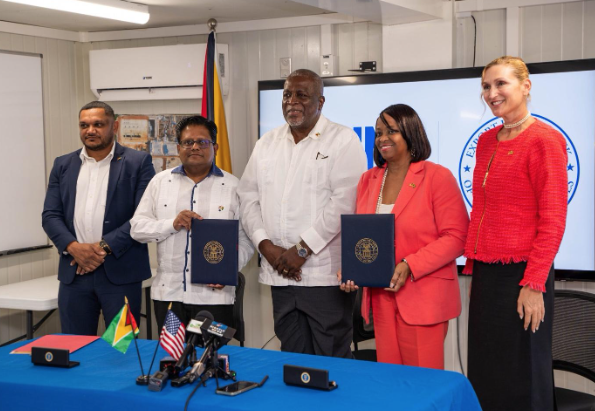Vickram Bharrat, Ministro de Recursos Naturales; Ashni Singh, Ministro de la Oficina del Presidente; Mark Phillips, Primer Ministro; Reta Jo Lewis, Presidenta de EXIM Bank; y Nicole Theriot, Embajadora de USA.