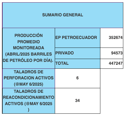 Adjunto el reporte referencial (rig report) del estatus de los taladros de perforación y workover en Ecuador @ Mayo 6/2025 *, los cuales también incluyen un gráfico que muestra la variación histórica de cantidad de rigs en actividad.