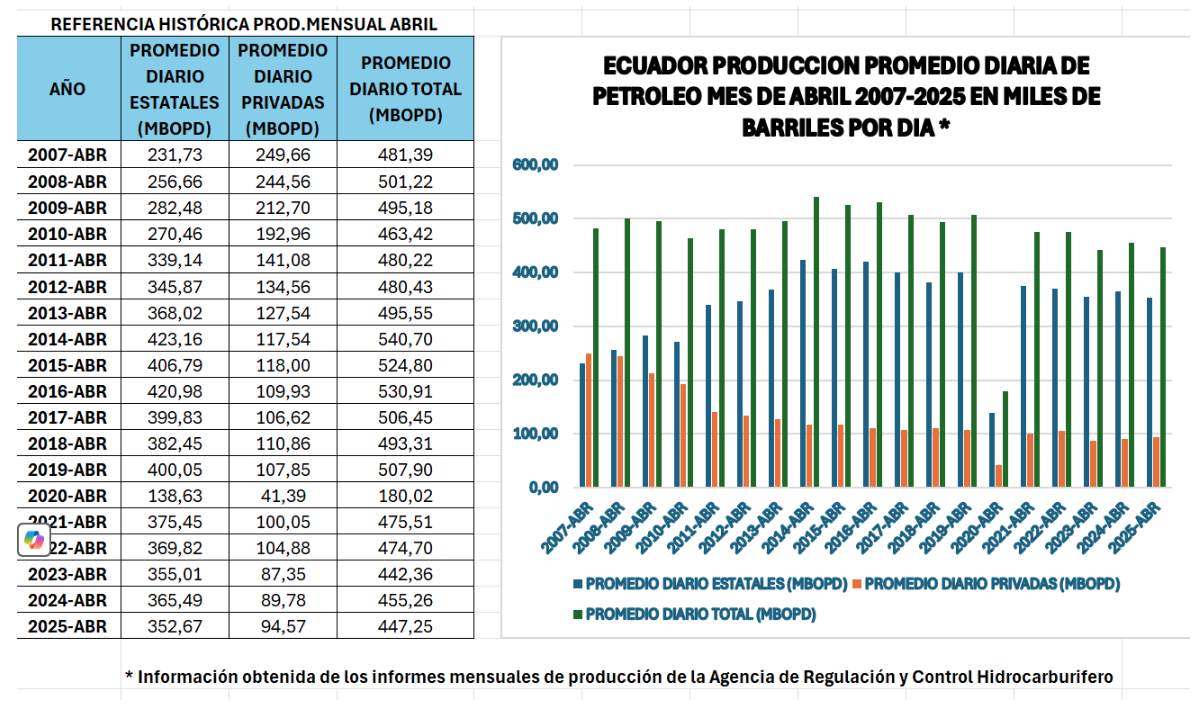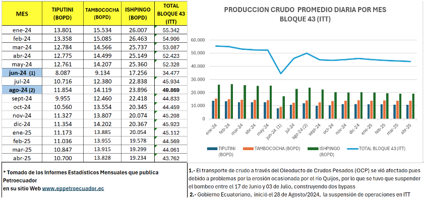 - Uno de los principales retos a los que se está enfrentando el gobierno es el cierre del ITT. El 28 de Agosto del 2024, el gobierno ecuatoriano anunció el comienzo del proceso de suspensión de operaciones en ITT, para lo cual desarrolló un evento con el cierre definitivo del primer pozo en ese campo, ver referencia oficial en https://www.eppetroecuador.ec/?p=23758 y una de las referencias de prensa en https://www.primicias.ec/economia/gobierno-cierre-pozo-itt-77508/. Desde esa fecha Petroecuador no ha realizado ninguna operación de Workover con taladro (la perforación ya se había suspendido algunos meses antes). Comparto un cuadro de la producción diaria promedio en cada mes de ese Bloque conformado por los Bloques Ishpingo, Tiputini y Tambococha entre Enero del 2024 y Abril del 2025. Les recomiendo un estudio desarrollado por el Banco Central en Agosto del 2023, denominado “Estudio de los impactos macroeconómicos de mantener el crudo del Bloque 43-ITT indefinidamente en el Subsuelo”