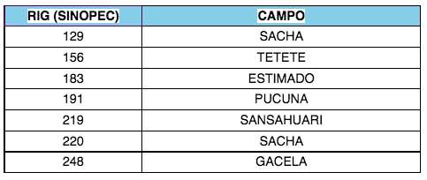 - SINOPEC fue adjudicada por PETROECUADOR dentro de los concursos SERVICIOS ESPECÍFICOS INTEGRADOS PARA LA PERFORACIÓN Y COMPLETACIÓN DE POZOS. por lo cual proveerá la perforación de pozos en las Zonas Norte y Zona Oeste. Se tiene planificado que los rigs estarían distribuidos de la siguiente manera: