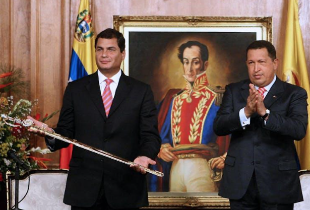Hugo Chávez le entrega a Rafael Correa, Presidente de Ecuador, una réplica de la espada de El Libertador.
