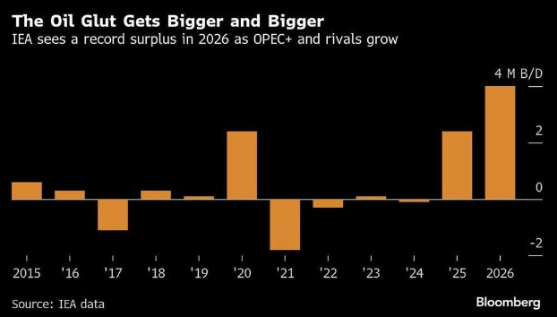 En su informe sobre el mercado petrolero del mes de Noviembre, la agencia proyectó que la oferta mundial aumentaría hasta alcanzar aproximadamente los 108,7 millones de barriles diarios para el 2026, a medida que la OPEP+ levantara sus recortes y entrara en producción nueva oferta proveniente de Estados Unidos, Brasil y Guyana.
