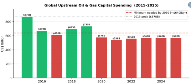 Por debajo de las hojas de cálculo de la AIE, la industria llevaba años invirtiendo por debajo de lo necesario. El gasto global en el sector *upstream* (exploración y producción) de petróleo y gas se situó en 2022-2023 en torno a los 500.000-570.000 millones de dólares anuales; una cifra que seguía un 35 % por debajo del máximo alcanzado a mediados de la década de 2010, a pesar de que tanto los costes como la demanda eran superiores.
