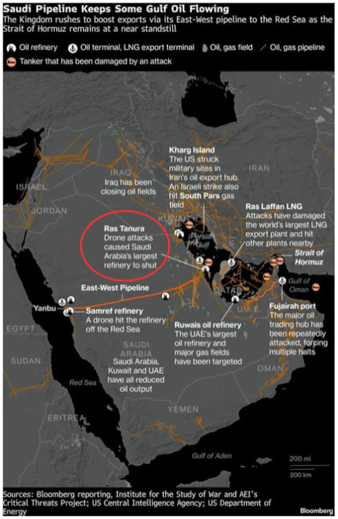 • Ras Tanura constituye el epicentro de la logística saudí para la exportación de crudo y productos refinados.