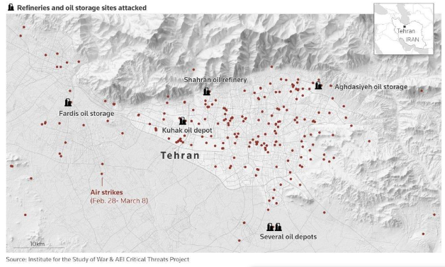 Para el propio Irán, la guerra está atacando la infraestructura que transforma las reservas en barriles utilizables. Los ataques israelíes y estadounidenses han alcanzado múltiples depósitos de almacenamiento de petróleo y la refinería de Teherán, provocando grandes incendios en el almacén de Aghdasieh, el depósito de Shahran, una instalación en Karaj y unidades de la refinería en los alrededores de la capital.