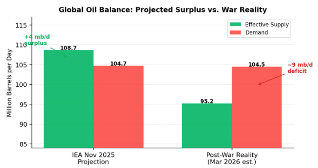 La AIE proyectaba un superávit de 4 mb/d para el 2026. La guerra ha transformado esa cifra en un déficit estimado de 9 mb/d.